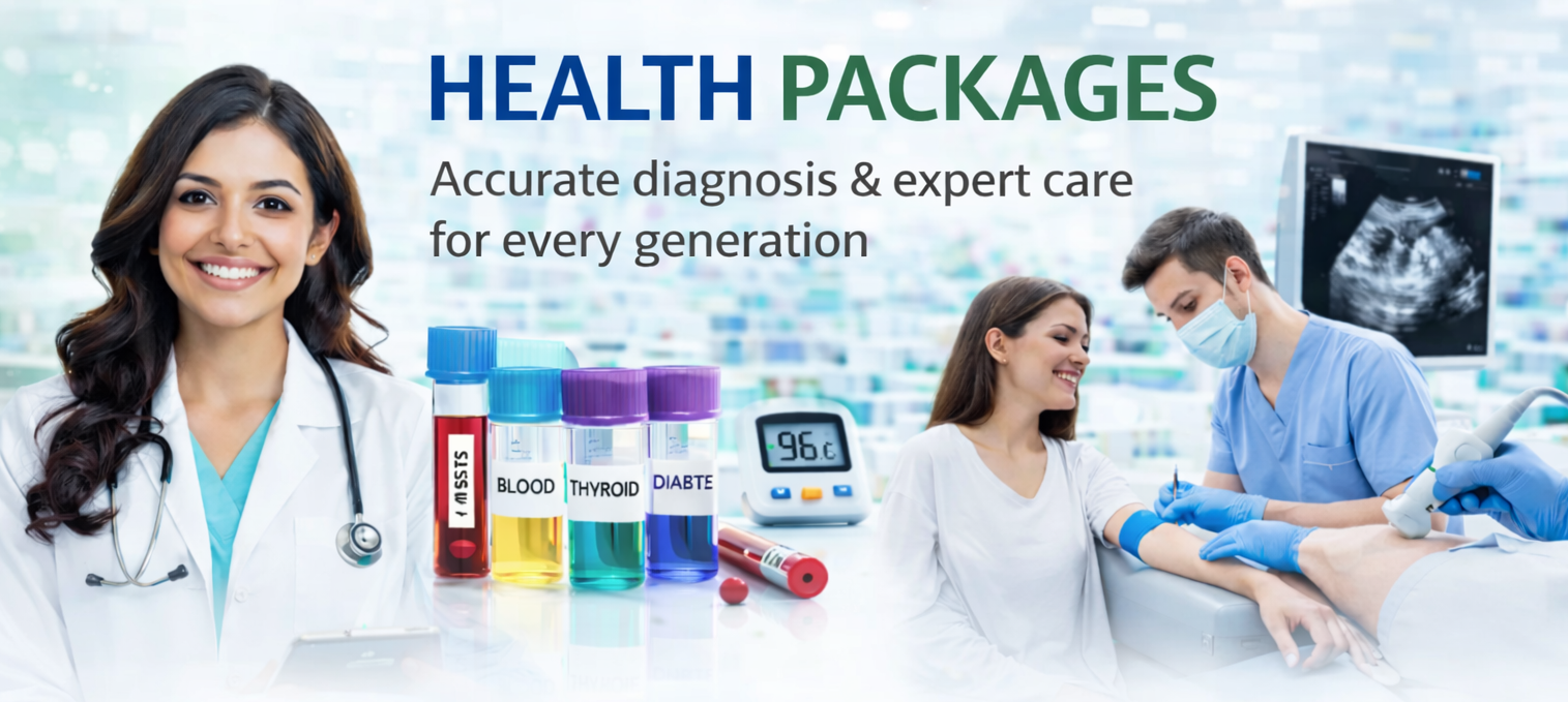 We offer CBC, blood sugar, thyroid, lipid profile, liver & kidney tests, diabetes panels and full body health checkup packages.